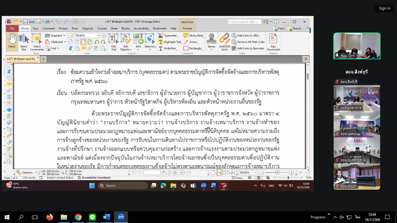 วันศุกร์ที่ 16 มกราคม 2569 เวลา 13.30 น. นางสาวรัชฎา เมธาวีกุลชัย อุตสาหกรรมจังหวัดสิงห์บุรี พร้อมด้วยนางสาวชัญญนิษฐ์ บุญสุวรรณ หัวหน้ากลุ่มนโยบายและแผนงาน นางสาววิไลวรรณ แสงดาว เจ้าพนักงานพัสดุชำนาญงาน และนางสาวพัทธนันท์ ภูมิศรีศักดิ์ เจ้าพนักงานการเงินและบัญชีชำนาญงาน เข้าร่วมประชุมซักซ้อมความเข้าใจงานจ้างเหมาบริการ (บุคคลธรรมดา) ผ่านระบบ Zoom Meeting โดยมีนายวชิระ ไม้แพ ที่ปรึกษาด้านกฎหมาย (นิติกรทรงคุณวุฒิ) เป็นประธาน