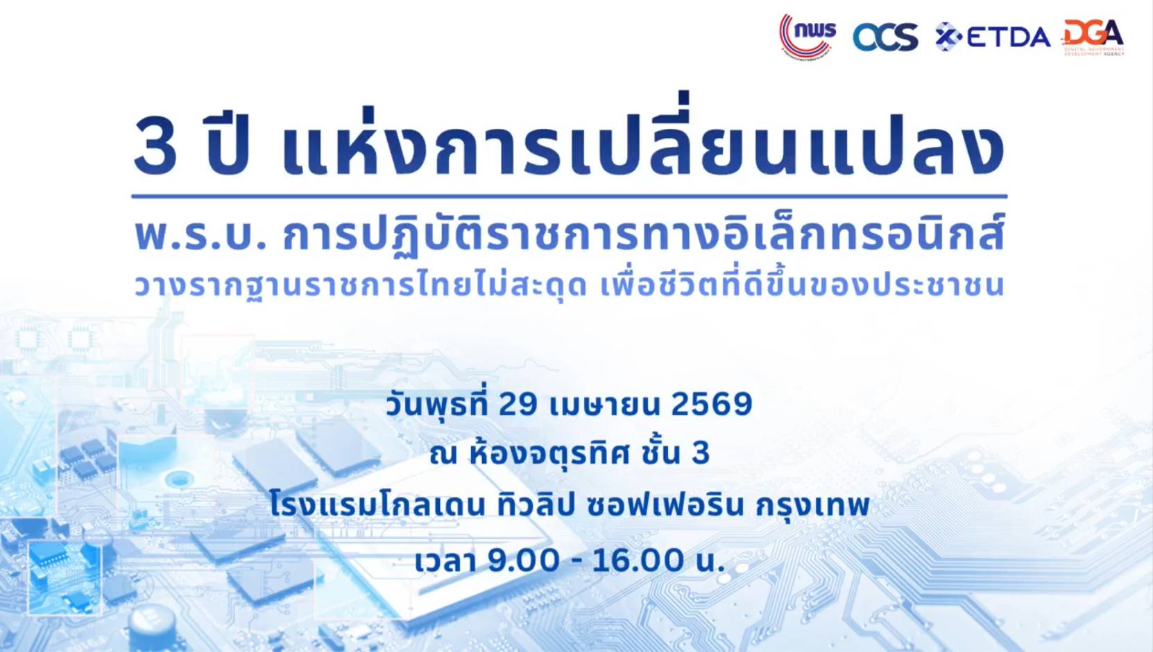 รับชมการประชุม “3 ปี แห่งการเปลี่ยนแปลง พ.ร.บ. การปฏิบัติราชการทางอิเล็กทรอนิกส์วางรากฐานราชการไทยไม่สะดุดเพื่อชีวิตที่ดีขึ้นของประชาชน"